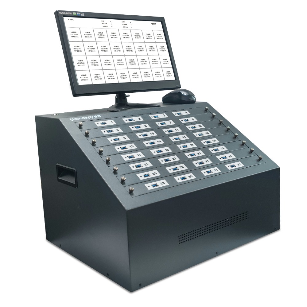一屏显示32个端口信息,通过USB端口红、绿灯即可判断成功与失败,鼠标操作。