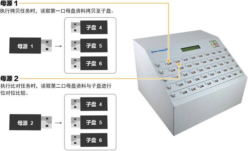 6、【双母源复制+比对】功能,1号口为执行拷贝的母盘,2号口为比对的母盘。