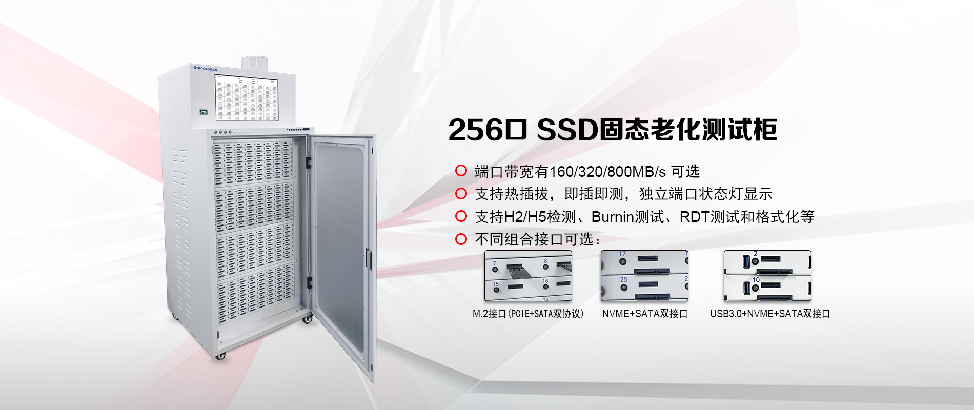 SSD硬盘常高温老化测试机、TF/UDP无痕拷贝检测机、USB3.0拷贝机、客制自动化设备等。