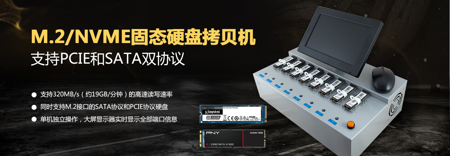 一拖3 M.2 SSD拷贝机一次性复制3个NVME或M.2(SATA)固态硬盘,写入速率高达320MB/s。