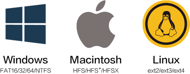 支持文件系统类型: FAT, FAT32, exFAT, NTFS, ext2/3/4,HFS/HFS+/HFSX