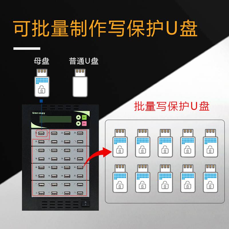 1、单机作业,无需连接电脑或者显示器,自带LCD屏和按键,亦可通过USB端口左侧的红、绿灯判断成功与失败。