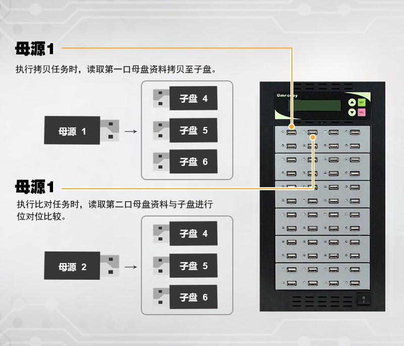 6、【双母源复制+比对】功能,1号口为执行拷贝的母盘,2号口为比对的母盘。