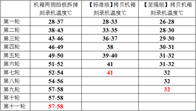 测试结果说明,两侧拆掉挡板的散热方式是错误的,这样会导致刻录机温度升高到57-58℃的高位,因为刻录机温度超过40℃后,激光头功率将大幅度衰减,所以前述方式将导致降速、刻废盘、死机、刻录机寿命大幅缩短等诸多问题。而普通标准版机箱最高可以达到41℃,说明在连续刻录多轮后,需要休息降温,否则仍然会因温度过高产生问题,例如降速。而第三列的至强版机箱,最高温度只有32℃,仅仅比室内温度高7℃,这将保证刻录机可以连续稳定的高速刻录,并且更少的刻废光盘。